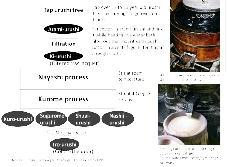 Barks and wood chips are filtered out from arami-urushi through the filtration process. After the filtration it is called ki-urushi which can be used for undercoating and fuki-urushi technique. Then it will be stirred at room temperature (nayashi process) and heated and stirred again (kurome process) which makes urushi amber-colored smooth suki-urushi.